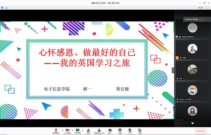 第二部分由研究生代表黄官骏,本科生代表杨孝彬、张文博为同学们分享抗疫故事。黄官骏同学主要和学弟学妹分享了在英国交流学习的感受以及在疫情期间辗转回国的经历,他深刻体会到国内外抗击疫情的差别,怀揣一颗感恩之心感谢祖国母亲及黄色直播