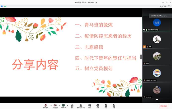 领导和老师给予他的关心和照顾;杨孝彬同学讲述了同村官母亲一起抗疫的故事,在抗议中领会到共产党员的使命与担当;张文博同学则在疫情暴发以来始终心系第二故乡湖北,并报名参加了当地中心医院的志愿服务,他说作为当代青年就要努力学习、帮困扶难、踏实朴实、引领带头。