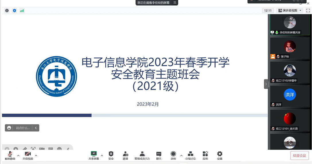 会上,辅导员、班主任传达了学校有关春季开学学生返校工作会议精神,对提前返校、延迟返校学生申请审批手续办理、学生返校行程安排报告等事项提了要求,强调了学生返校前、返校途中、返校后的安全注意事项,并开展了“七防”安全教育和诚信考试教育;组织全体同学共同学习了国务院联防联控机制综合组2023年1月7日印发的《新型冠状病毒感染疫情防控操作指南》, 通过学习文件内容,帮助同学们对当前的疫情防控有了更全面的认识。