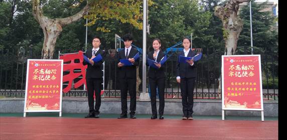 升旗仪式第二项,四名学生代表高贝乐、王欣然、祝康涛、宋佳婉慷慨激昂地朗诵了《青春中国》,表达了对祖国最诚挚的爱意。