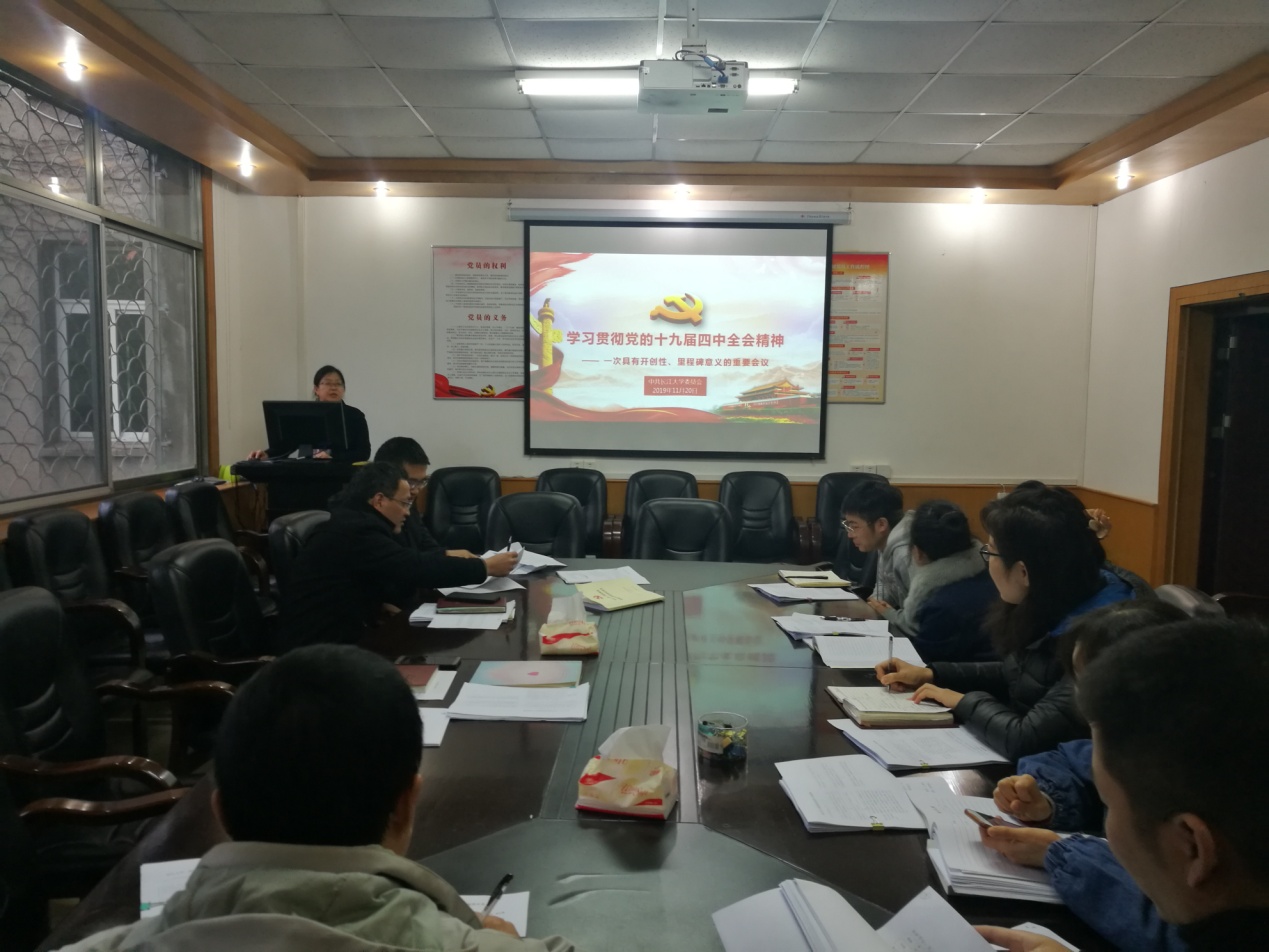 20191125日下午电信黄色直播 分党委分别召开理论学习中心组学习和党支部书记会议,由分党委书记宣讲四中全会精神。会后各党支部组织开展11月份第二次支部主题党日活动,集中学习贯彻党的十九届四中全会精神。28日分党委书记刘逸组织全体教职工和学生党员、发展对象学习贯彻党的十九届四中全会精神。在学习贯彻党的十九届四中全会精神会上,通过“一图读懂四中全会”熟悉了党的十九届四中全会的会议内容、我国国家制度和国家治理体系具有的显著优势、坚持和完善中国特色社会主义制度推进国家治理体系和治理能力现代化的总体目标和工作要求;通过观看微视频“字里行间看《决定》”,对《决定》中的3大板块、15个部分、200多项重大举措、222个高频关键词“制度”有了更全面的了解;通过学习“上善若水,水滴石穿——学习贯彻党的十九届四中全会精神等内容”,对党的十九届四中全会精神有了更深入的理解和体会。刘书记结合宣讲党的十九届四中全会精神,讲了一次形势与政策课,上了一堂生动的主题教育党课。