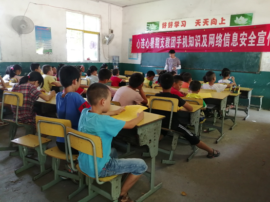 图为支教队员为孩子们讲述手机知识及网络信息安全宣传