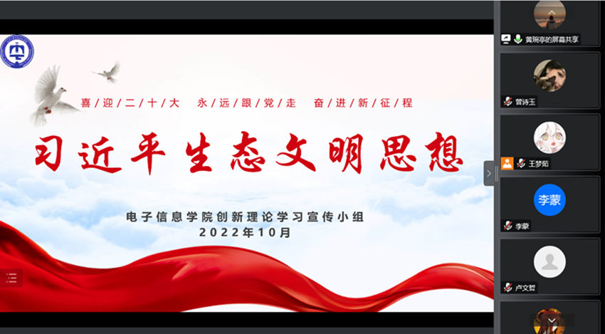 会上,黄婉亭同学首先向同学们讲述了《习近平生态文明思想学习纲要》的重要作用,阐述了习近平生态文明思想的科学内涵;她结合自己暑假期间参与学校“知行中国”实践活动在荆州和武汉经历,向同学们生动形象地展示了在以习近平同志为核心的党中央带领下,我国在生态文明建设领域中取得巨大成就,体现了我党团结带领全国人民创造更加幸福美好生活的决心;最后,黄婉亭还向同学们介绍了“碳中和”和“碳达峰”的内涵和理念。