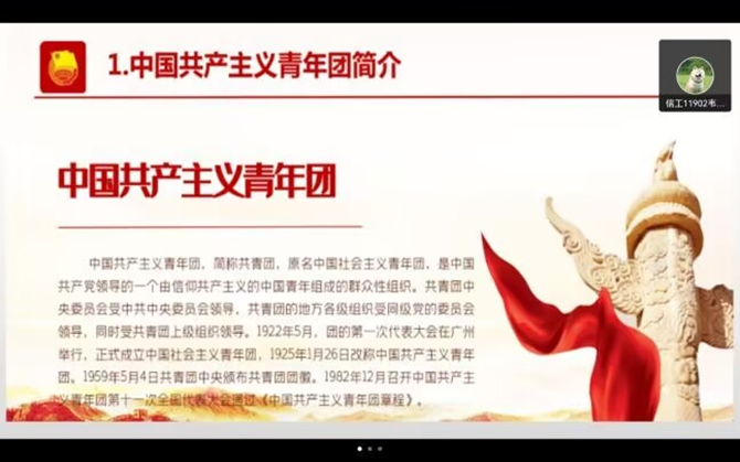 10月24日下午,信工11902团支部团会在腾讯会议举行。同学们深入开展了学习习近平总书记在庆祝中国共产主义青年团成立100周年大会上重要讲话精神,并进行了劳动教育专题学习。薛文荣等同学用融媒体,沉浸式地向大家展现了二十大召开的重要意义;随后团支部书记带领大家学习了习近平总书记关于劳动教育的重要论述,鼓励大家开展“让新时代劳动教育起好步,创建美丽校园”行动,大力营造崇尚劳动、热爱劳动的校园劳动氛围。