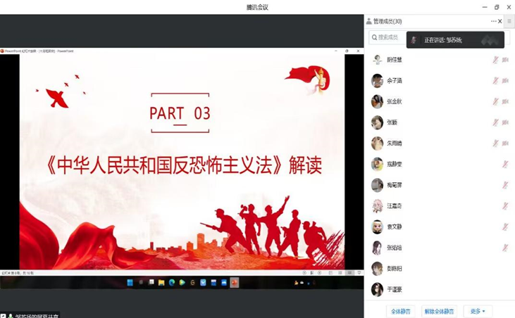 10月22日晚,信卓12101团支部在腾讯会议举行十月团会。邹苏扬带领支部团员和青年们学习了习近平总书记关于宗教工作的重要论述和《中华人民共和国反恐怖主义法》,并呼吁大家在疫情防控阶段自觉遵守学校各项防控规定,养成健康的卫生习惯,提高预防传染病的意识和能力,能够科学、正确地应对疫情。最后大家共同观看了反恐怖主义法相关视频,同学们积极发表自己的感想,营造了良好的氛围。