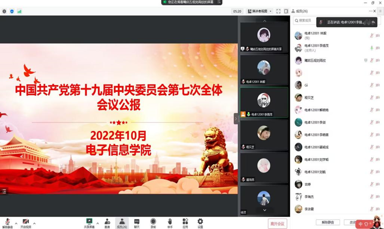 10月21日下午,电卓12001团支部团会在腾讯会议举行。本次团会的主要学习内容有:习近平总书记在中国共产党第二十次全国代表大会上所作的报告及中国共产党第十九届中央委员会第七次全体会议公报。通过学习两篇报告的重要精神,并结合党的百年历史,让支部团员和青年们深刻领会到作为一名新时代的青年应弘扬伟大建党精神,自信自强、守正创新、勇毅前行,为全面建设社会主义现代化国家、全面推进中华民族伟大复兴而团结奋斗!