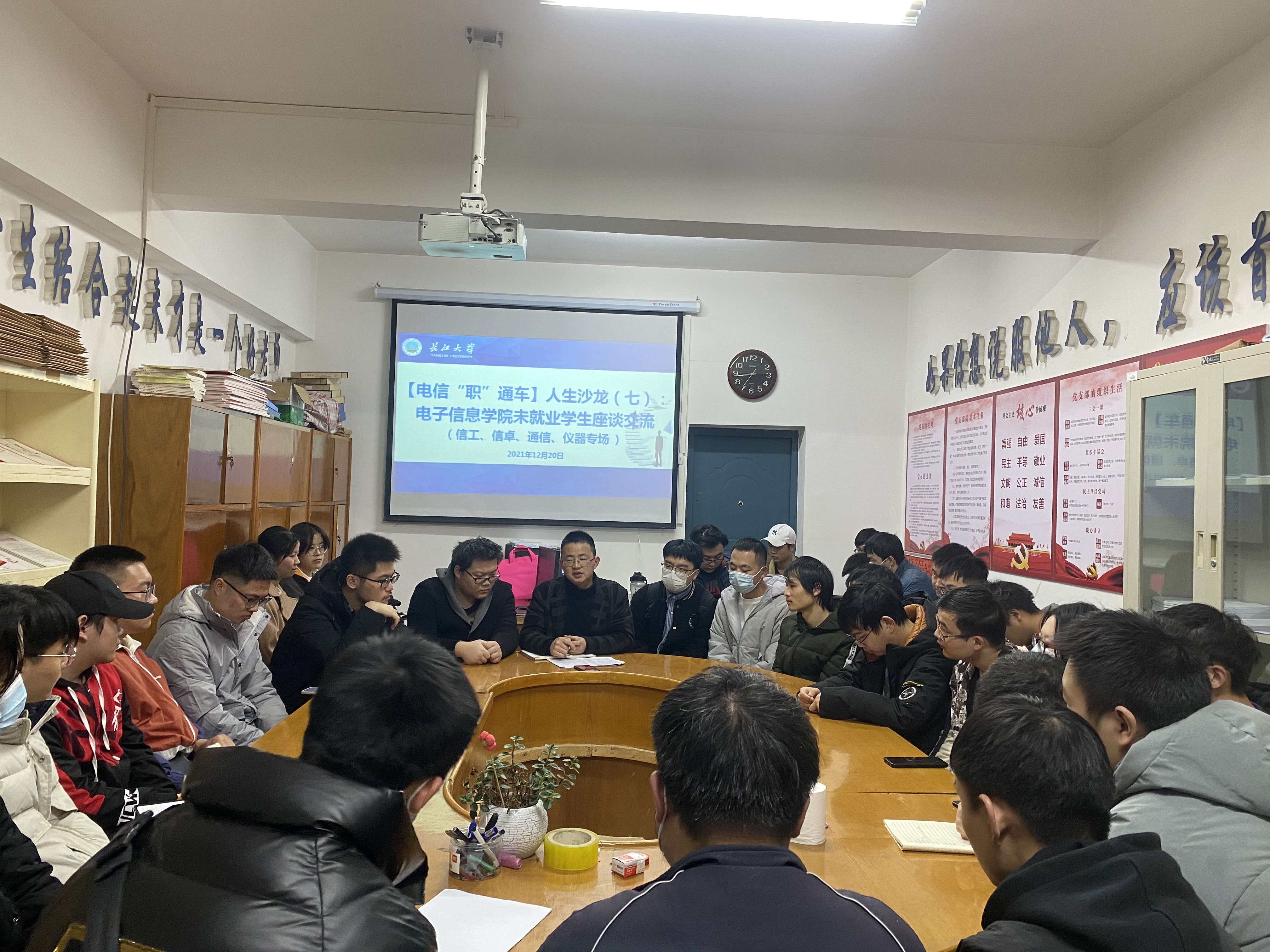 目前毕业年级学生的就业情况,并以当前的就业形势和招聘企业的真实情况来号召大家树立正确的就业观。在场的学生相互之间畅所欲言,就自身而言介绍自己求职过程中的一些具体情况,面对面地详细了解自己的求职意愿和遇到的问题。谈话过程中,两名已经签约的同学也交流分享了自己的求职面试经验,所有学生发言完毕后,沈老师对学生的发言进行了问题总结,并一一进行了解答。最后二位老师针对每位学生的情况提供了宝贵的建议,更要求大家要主动作为,规划好未来,为找工作做好充足的准备。