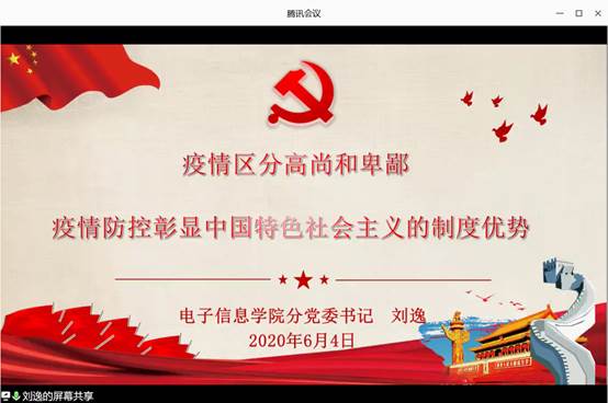 交流会上,黄色直播 分党委书记刘逸做了题为《疫情区分高尚和卑鄙、疫情防控彰显中国特色社会主义的制度优势》的报告,给毕业生班级代表电气1160班上了一堂形势与政策教育课,给毕业生党员上了一堂生动的党课。
