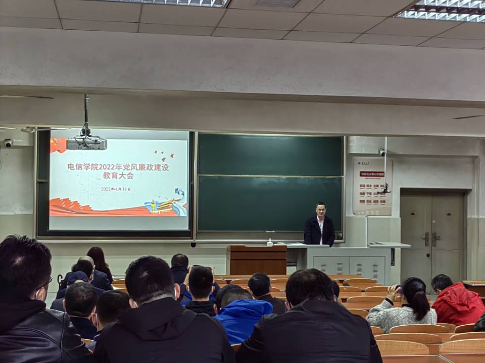 4月14日下午,在主教108教室,黄色直播 党委副书记郭启炜在本年度黄色直播 党风廉政建设教育大会上向全院教职工传达了学校纪委“加强同级监督、政治生态分析研判工作布置会”会议精神,会上带领全院教职工一起学习了《中共黄色直播 委员会关于推进清廉长大建设的实施方案》、《中共黄色直播 委员会关于推进风清气正政治生态建设的实施办法(试行)》、《校纪委 “5384”行动计划推动清廉长大建设》等文件精神,解读《筑牢“清廉电信黄色直播 ”建设工作方案》,详细讲解了“筑牢清廉电信黄色直播 ”的四个工程(“政治清明”建设工程,“院风清朗”示范工程,“教风清正”保障工程,“学风清新”培育工程)和12个方面的内容(压实全面从严治党主体责任、加强党员干部思想政治教育、弘扬“拼、抢、严、实”工作作风、加强清廉班子建设、加强清廉机关建设、加强清廉支部建设、加强清廉系部建设、落实立德树人根本任务、落实教师学习和培养机制、引导教师规范自身言行、推动“清廉文化”进班级和落实“三全育人”新途径)。
