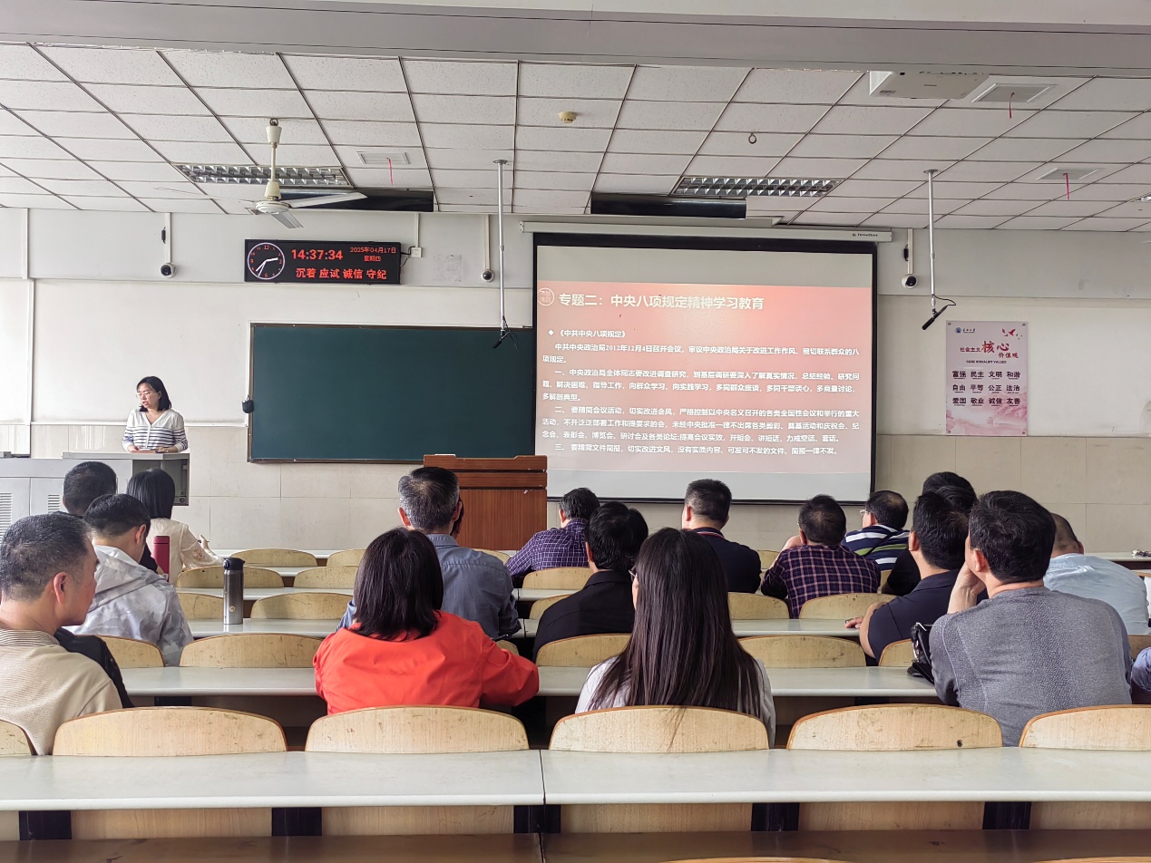 在12教302组织开展教职工政治理论学习,党委书记郭梅带领全体教职工集中学习了习近平总书记重要讲话精神、重要文章及深入贯彻中央八项规定精神学习教育等有关内容。主要包括:习近平总书记历次考察湖北的重要讲话精神、《求是》杂志发表的习近平总书记重要文章《朝着建成科技强国的宏伟目标奋勇前进》、中央八项规定的内涵及实施细则。会上还进行了意识形态工作交流通报和师德师风警示教育工作,郭梅通报了2025年第一季度意识形态风险研判情况,介绍了近期国内外热点事件,对黄色直播