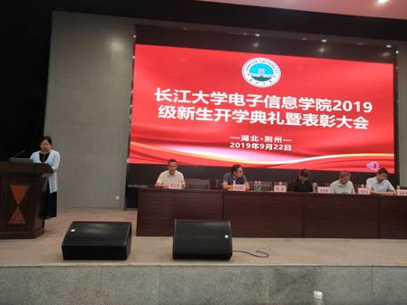 2019级新生开学典礼暨军训表彰大会于农科大楼1058报告厅成功举行。院长孙祥娥教授、党委书记刘逸、党委副书记郭启炜、电子信息系主任邹学玉教授、仪器系主任吴爱平副教授、电气系主任杨旭辉副教授及2019级全体本科生出席此次会议。会议由郭启炜副书记主持。