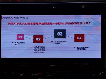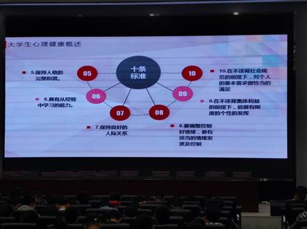 紧接着何老师列举了大学生常见的心理问题,老师就以最贴近我们学生的实例:宿舍之间的关系,他拿出他的学生的事例详细的分析了我们的问题,并且给予我们解决的方法。