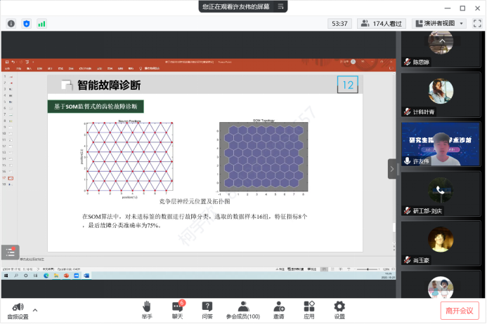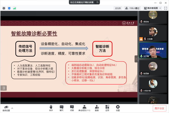 叶青老师作现场点评提出相应建议。周箩鱼老师建议在进行机器学习研究时也不能完全放弃传统算法,要将图像和机械等方面传统的原理算法与深度学习相结合,传统原理与方法转换成损失函数运用在深度学习中会有新的增长点。叶青老师指出端到端的智能诊断方法具有实际应用研究意义的同时对数据要求较高,希望同学们理性看待交叉领域的学习并思考自己的研究领域是否需要深度学习的结合,建议同学们可以分享研究过程中的创新点以及如何寻找创新点。