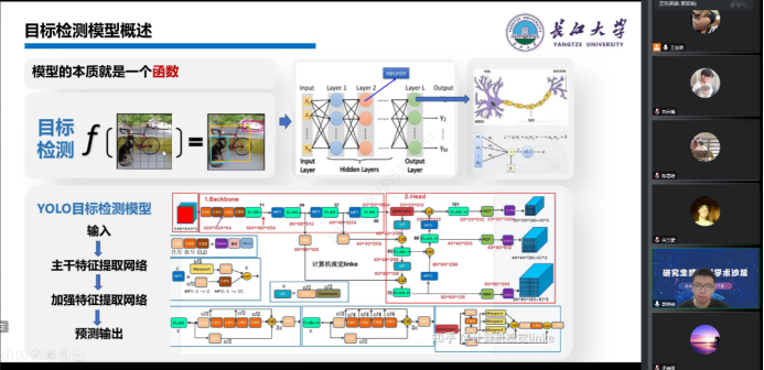 的郭奕裕同学以遥感目标检测为主要的研究方向,为同学们分享了他的研究内容《一种面向不平衡数据集的轻量化SAR舰船检测模型》,他从目标检测模型的本质与发展历程引入,为同学们介绍了现有目标检测模型存在的不足,提出了掩膜数据平衡增强方法,高效注意力机制模块、自适应的多尺度融合模块三个方面的改进方法。最后在论文方面进行了详细的论文结构讲解和文献检索、画图的辅助工具的分享。
