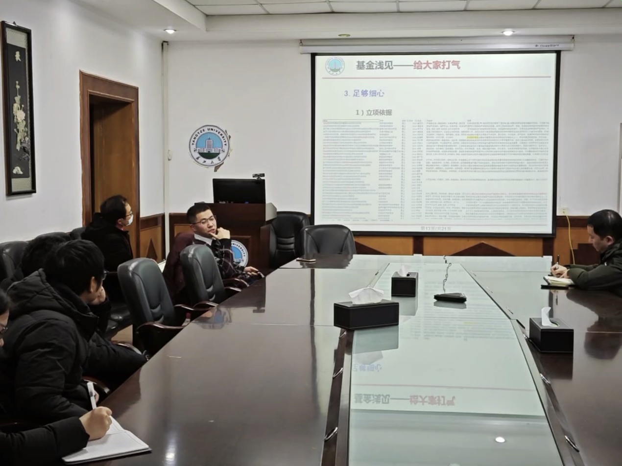 科研教师在10教205会议室听取了周箩鱼老师的基金申请经验报告会。本次会议由分管领导魏勇副院长主持,黑创、孙长河、甘如饴、何小英、胡洲、杨旭辉等10余名中青年教师参会。