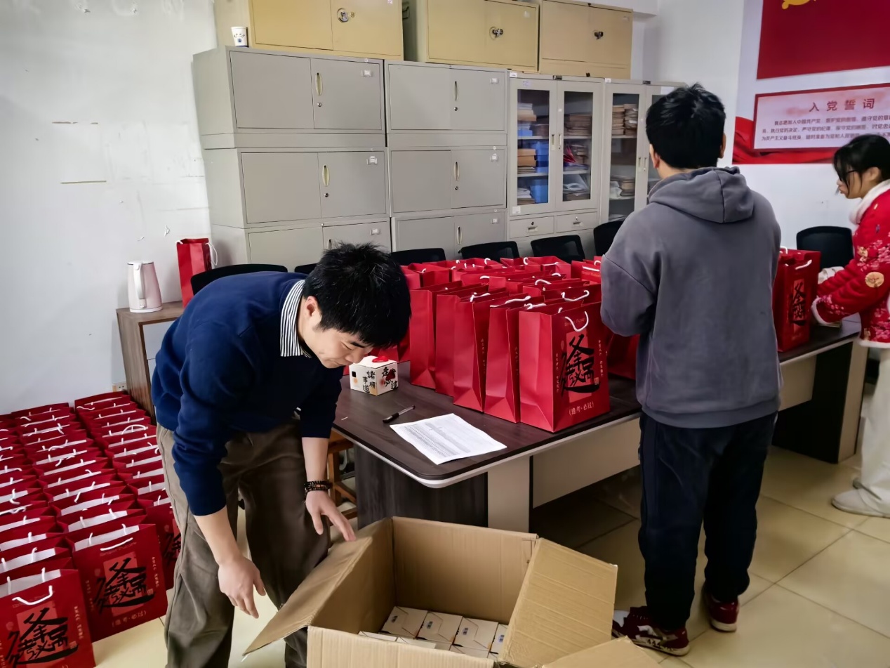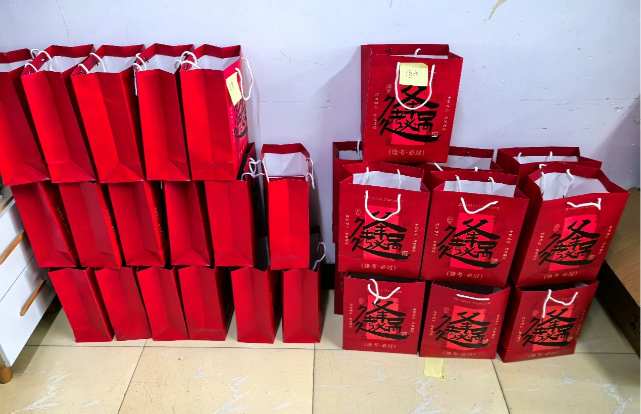 领导亲身参与策划,和年级辅导员、班主任一起组成“送福小分队”积极配合,共同开启暖心祝福。12月16日上午,学生志愿者开始考研大礼包的分装,大家分工明确,井然有序地将一份份蕴含着美好寓意的礼物包装好。