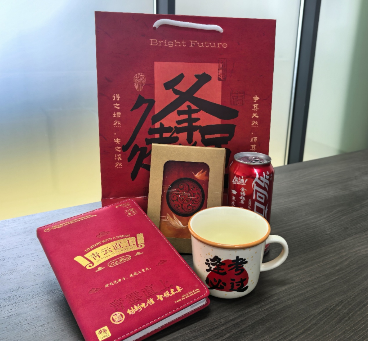 手提袋印制“逢考必过”“成功上岸”等加油语,真诚祝愿每一位考生考试顺利、研途坦荡。红色定制笔记本封面印有黄色直播